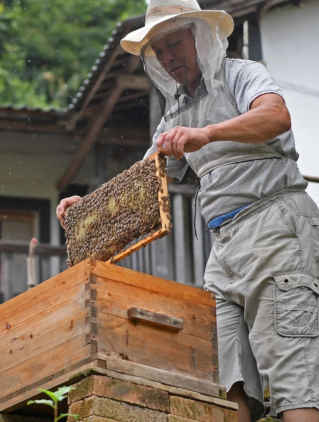 寻乌县文峰乡双坪村村民王达礼查看蜂箱